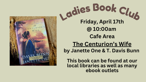 We are reading “The Centurion’s Wife” by Janette Oke and T. Davis Bunn. This is a sweeping saga of the dramatic events surrounding the birth of Christianity and also the very personal story of Leah, a young Jewess of mixed heritage trapped in a vortex of competing political agendas and private trauma.