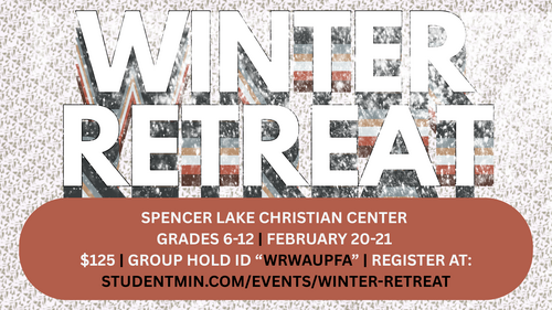 Winter Retreat is a fun-filled weekend designed for students to grow in their faith and connect with others. Students will have the opportunity to attend breakout sessions, participate in live worship, and hear a challenging message from our guest speaker. Registration fee is $125 and can be completed online at: studentmin.com/winter-retreat.