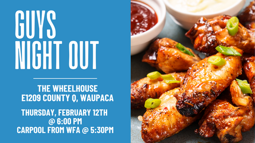 Guys, join us at The Wheelhouse, E1209 County Q, Waupaca, for a relaxed evening of good food and fellowship. It’s a great opportunity to connect and enjoy time together. Sign up at the Connect Corner. Carpool leaves WFA at 5:30.