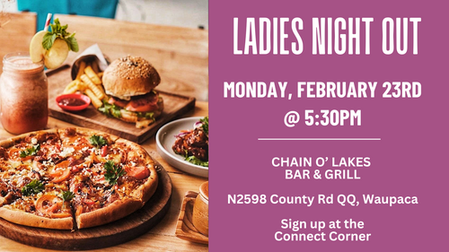 Ladies, don’t miss our first LNO of 2026! We’ll be heading to Chain o’ Lakes Bar & Grill, N2598 County Rd QQ, Waupaca, for some great food and a time of connecting. Sign up today at the Connect Corner.
