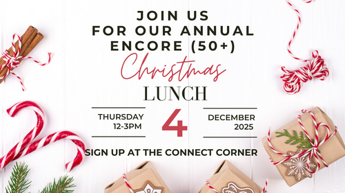 Join us for our Encore Christmas Party—a festive time of fellowship, carols, a shared meal, and a lively white elephant gift exchange. Be sure to sign up at the Connect Corner!