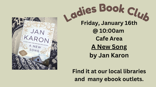We are reading “A New Song” by Jan Karon. In this book of the Mitford series, longtime Episcopal priest, Father Tim, retires. However, new challenges and adventures await when he agrees to serve as interim minister of a small church on Whitecap Island. In this fifth novel of the beloved series, fans old and new will discover that a trip to Mitford and Whitecap is twice as good for the soul.